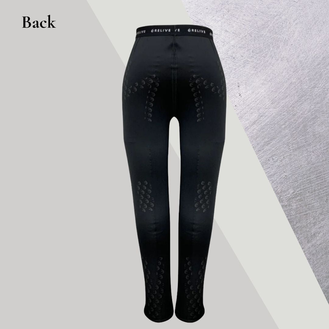 In addition to the standard Relive Underwear design, these tights have two prints on the back and side of the thighs, and two V-shaped prints near the Achilles tendons.